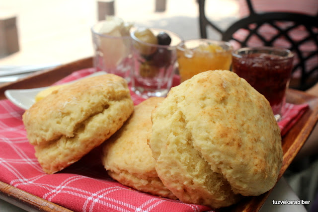 Scone, üç çörek, iki ev yapımı reçel, zeytin, krem peynir ve tereyağından oluşuyordu. Çörek tek başına bile yenilecek cinstendi; öyle güzeldi. Fırından yeni çıkmış, sıcacıktı. Tereyağı sürdüğümüzde hemen eriyip ekmekle bir oldu. Sunum da çok güzeldi. Üzerinde kareli bir örtü olan tahta tabak organik hissini daha da pekiştirdi.